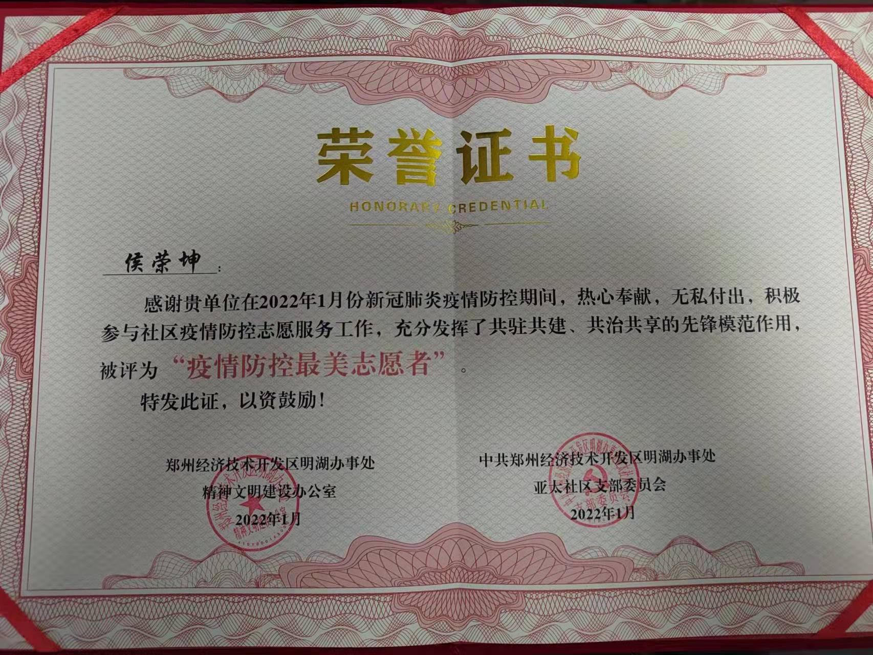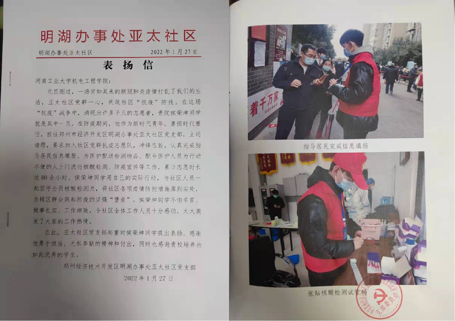 感谢信中提到,侯荣坤同学积极响应明湖办事处亚太社区党支部的号召,主动请缨,要求加入社区党群抗疫志愿队,在志愿防控工作中,不怕辛苦、做事扎实、工作细致,与社区人员一起为辖区群众筑起防疫的坚强“堡垒”,令社区全体人员十分感动,被授予“疫情防控最美志愿者”荣誉称号。侯荣坤同学的事迹也受到了河南商报,顶端新闻等省级媒体的报道。