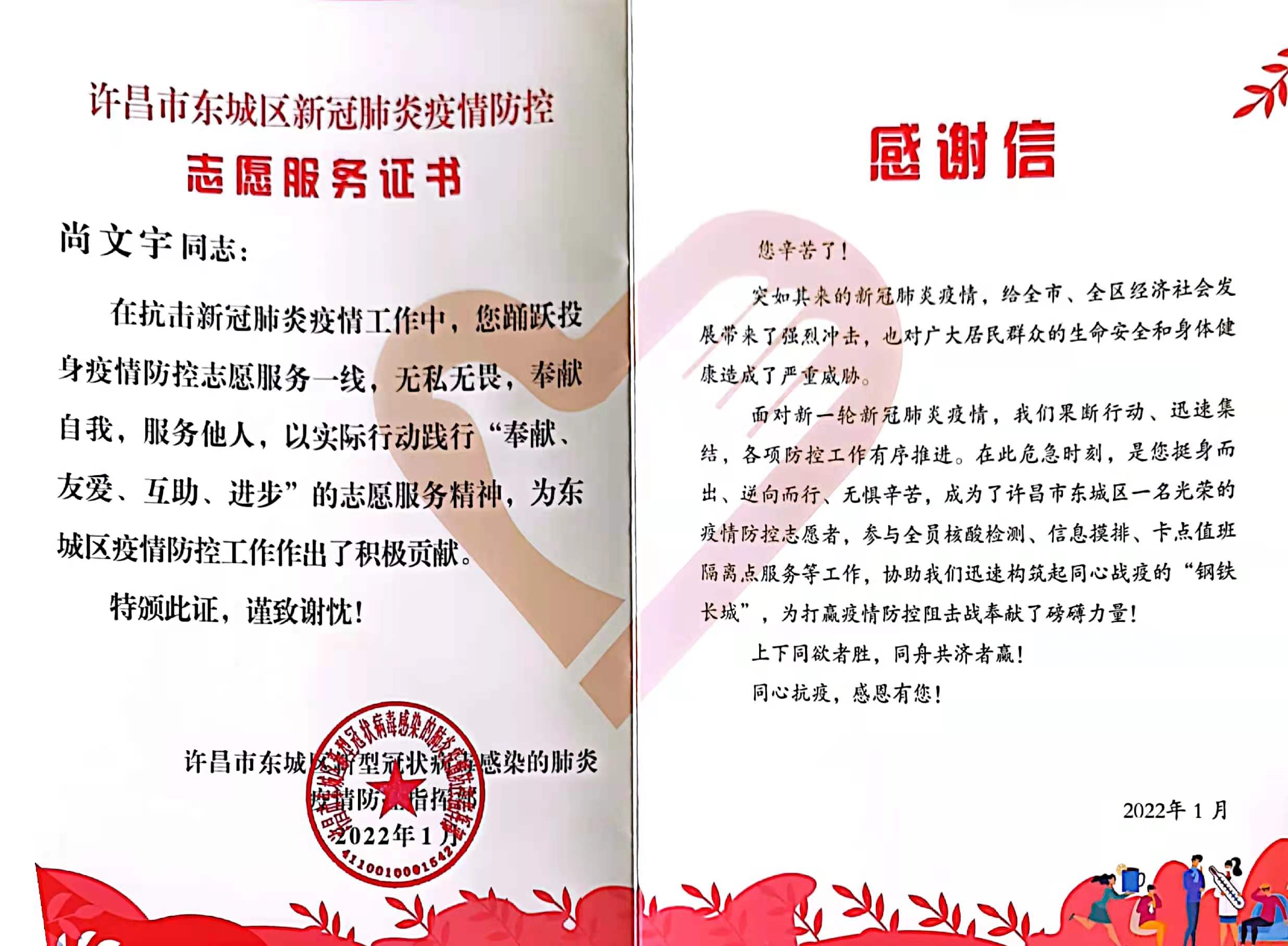 机械工程专业21级研究生尚文宇同学在许昌市新冠肺炎疫情防控工作中的突出表现,提出了表扬和感谢。