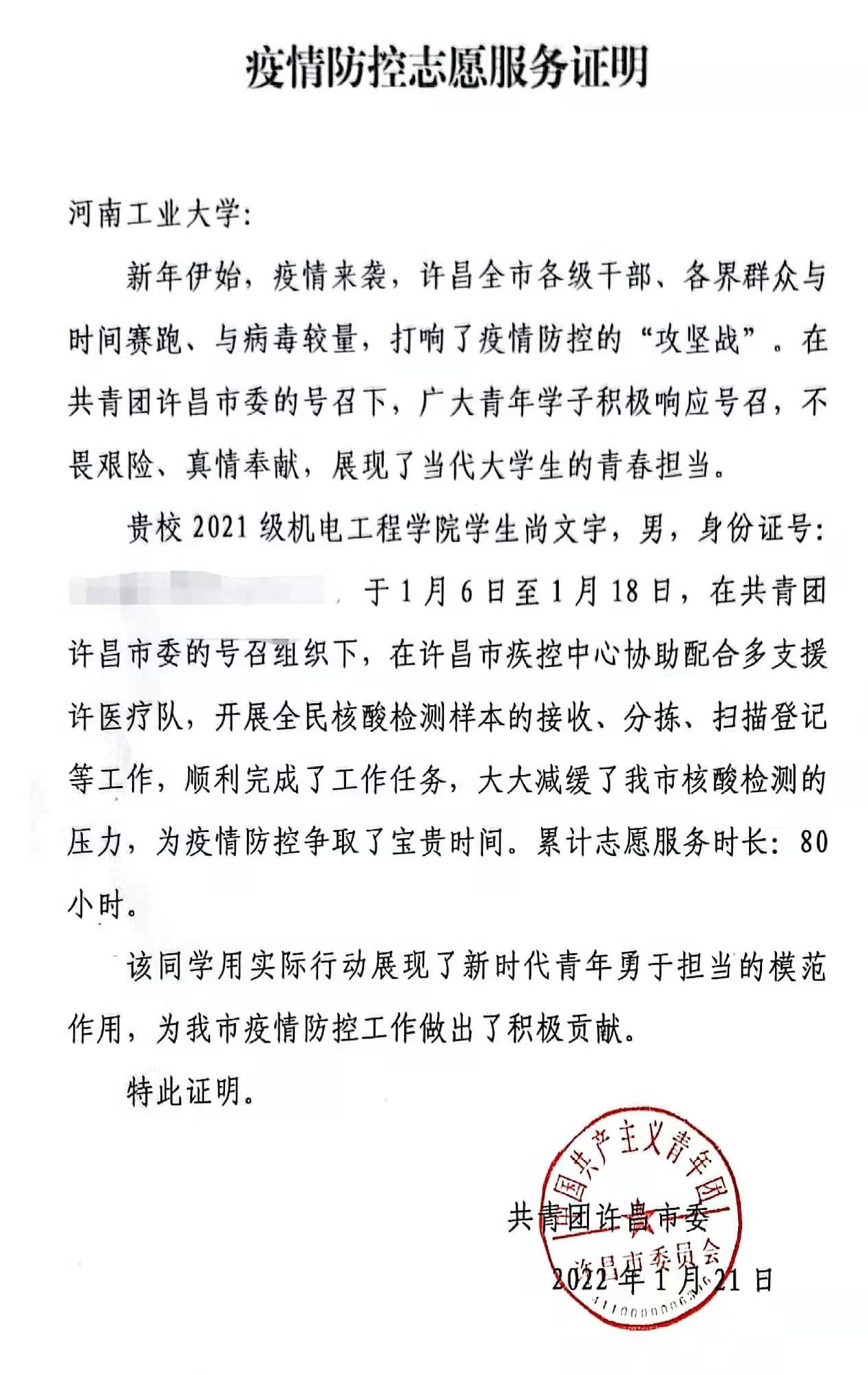 感谢信中提到,尚文宇同学积极响应共青团许昌市委的号召,主动请缨,要求加入许昌市支援疾控中心志愿队。在许昌市疫情防控工作中,积极参与、真情奉献、勇于担当,与广大青少年志愿者协助配合多支援许医疗队,开展全民核酸检测样本的接收、分拣、扫描登记等工作,大大减缓了许昌市核酸检测的压力,为许昌市疫情防控工作做出了积极贡献。尚文宇同学的事迹也受到了许昌日报,许昌零距离、河南共青团等媒体的报道。