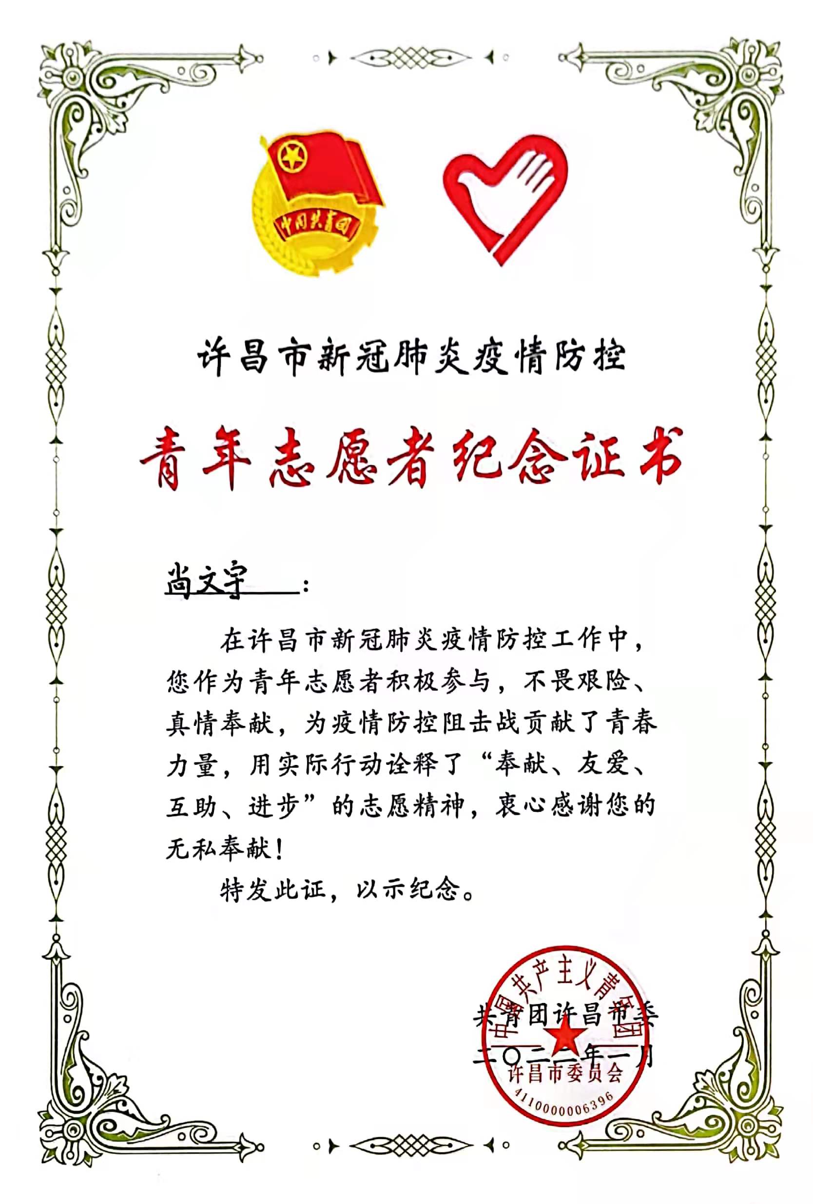 近日,我校收到共青团许昌市委、许昌市疾控中心、许昌市东城区新型冠状病毒感染的肺炎疫情防控指挥部等单位发来的感谢信和疫情防控志愿服务证明,对亚洲av