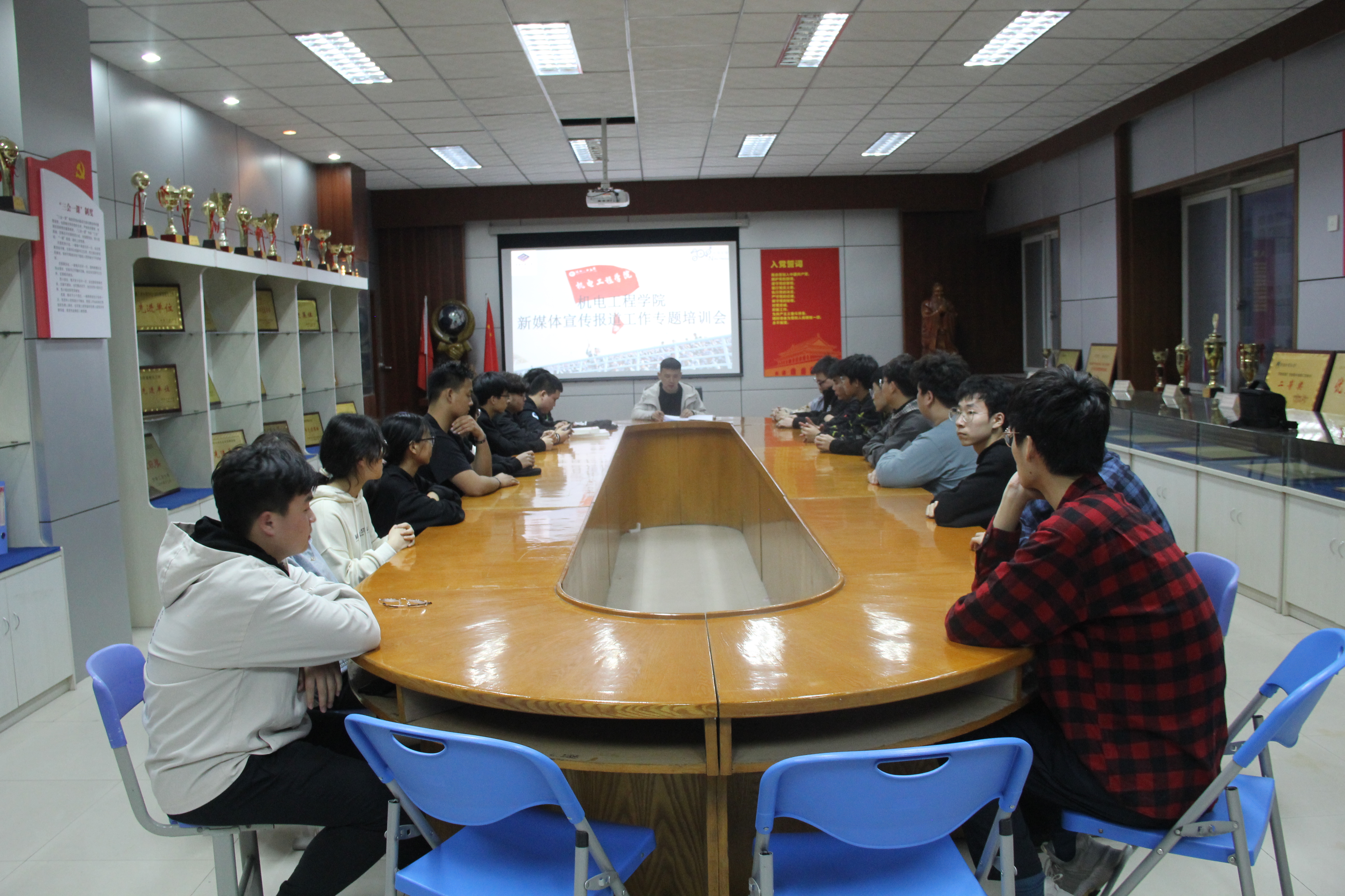 在7415会议室召开新媒体宣传报道工作专题培训会,辅导员鲁鹏主持了此次会议。