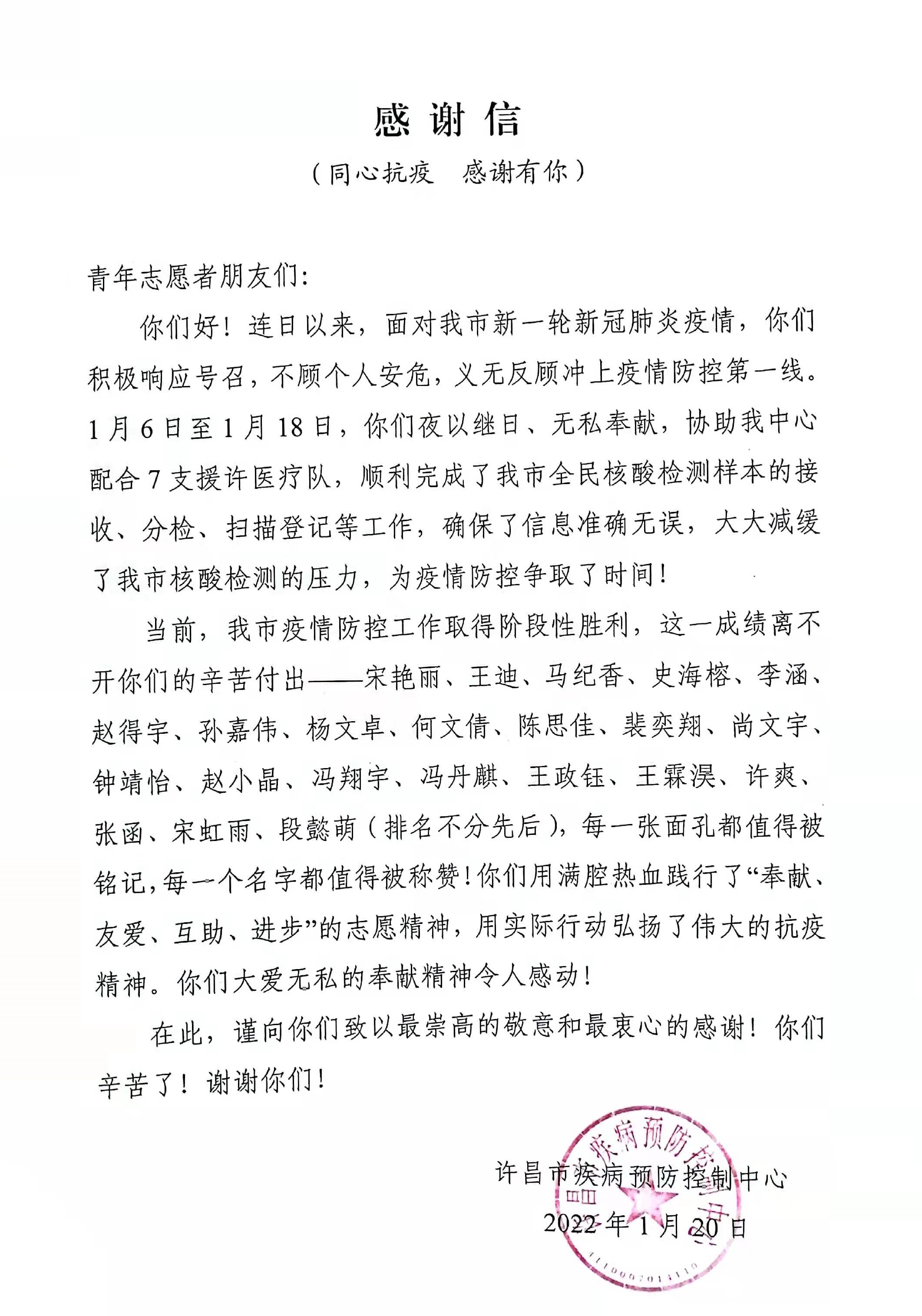 感谢信中提到,尚文宇同学积极响应共青团许昌市委的号召,主动请缨,要求加入许昌市支援疾控中心志愿队。在许昌市疫情防控工作中,积极参与、真情奉献、勇于担当,与广大青少年志愿者协助配合多支援许医疗队,开展全民核酸检测样本的接收、分拣、扫描登记等工作,大大减缓了许昌市核酸检测的压力,为许昌市疫情防控工作做出了积极贡献。尚文宇同学的事迹也受到了许昌日报,许昌零距离、河南共青团等媒体的报道。